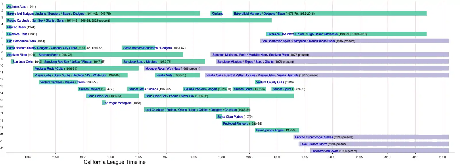 - Stockton Ports: 1946–1972; 1979–1999; 2002–present