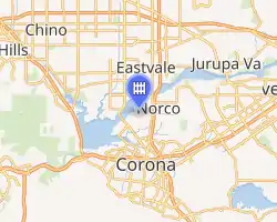 On the site where CRC now stands, the 700-acre (280 ha) Lake Norconian Resort opened in 1929 as "the opulent playground of some of Hollywood's biggest names."[13] The Norconian hotel closed in 1940, then served as a Navy hospital between 1941 and 1957.[13] "The old Norconian and several of the newer outlying buildings were turned over to the state" to create CRC,[13] and the first inmates arrived in January 1963;[14] however, in 2002 "CRC vacated the building after learning it had to be seismically retrofitted."[3] Efforts are underway to preserve the hotel.[13]