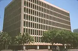 The California State Building in Santa Ana's Civic Center is one of many state buildings throughout California. The structure houses the Government of California's Orange County operations, such as the California Department of General Services and their subdivisions. Construction of the building began in 1972 and completed in 1973. The international style building is estimated to be 99 feet tall, has 8 stories, and has 3 elevators.[1]