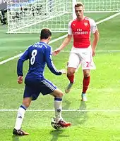 Chambers made his first appearance for Arsenal on 2 August 2014, starting in central defence in a 5–1 win against Benfica in the pre-season Emirates Cup tournament.[22] On 10 August, Chambers made his competitive debut for Arsenal, playing the full 90 minutes of the 2014 FA Community Shield against Premier League champions Manchester City at Wembley Stadium. Playing at centre-back instead of his usual right-back position to cover for Per Mertesacker, the BBC wrote on his performance against the Premier League champions that "his mature performance defied his youthful years".[23] On 16 August, Chambers played his first Premier League match for Arsenal in a 2–1 win against Crystal Palace.[24] He played the first European fixture of his career three days later, a goalless draw in the first leg of Arsenal's Champions League play-off away to Beşiktaş.[25]