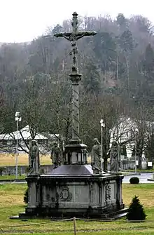A 16th-century calvaire from Louargat, Brittany, transplanted to serve as a World War I memorial, stands at the Carrefour de la Rose near the Belgian town of Boezinge north of Ypres.[2] The most notable Calvary monument outside Brittany is at Lourdes. This was specifically intended to represent Breton Catholicism. It was created by the sculptor Yves Hernot in 1900 as a gift to Lourdes from the main Breton dioceses: Rennes, Vannes, Quimper and Saint-Brieuc.[3][4] The monument comprises a single central cross set within a raised square base at each corner of which a statue of one of the witnesses to the crucifixion is placed.