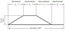 Cams can be characterized by their displacement diagrams, which reflect the changing position a follower would make as the surface of the cam moves in contact with the follower. In the example shown, the cam rotates about an axis. These diagrams relate angular position, usually in degrees, to the radial displacement experienced at that position. Displacement diagrams are traditionally presented as graphs with non-negative values. A simple displacement diagram illustrates the follower motion at a constant velocity rise followed by a similar return with a dwell in between as depicted in figure 2.[4] The rise is the motion of the follower away from the cam center, dwell is the motion where the follower is at rest, and return is the motion of the follower toward the cam center.[5]