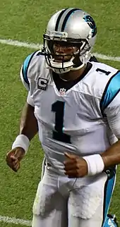 Newton made an impact in his first season when he set the rookie records for passing and rushing yards by a quarterback, earning him Offensive Rookie of the Year. The league's first rookie quarterback to throw for 4,000 yards in a season[3] and the first to throw for 400 yards in his NFL debut,[4] he also set the season record for quarterback rushing touchdowns.[5] Between 2013 and 2017, Newton led the Panthers to three division titles and four playoff appearances. His most successful season came in 2015 when he was named Most Valuable Player (MVP) and helped Carolina obtain a franchise-best 15–1 record en route to a Super Bowl appearance in Super Bowl 50. He is one of four African-American quarterbacks to win NFL MVP and was the first to solely receive it.[6]
