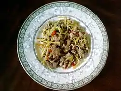 Cambodian cuisine is an umbrella term for the cuisines of all ethnic groups in Cambodia, whereas Khmer cuisine (Khmer: សិល្បៈធ្វើម្ហូបខ្មែរ; lit. 'Khmer culinary art') refers specifically to the cuisine of the Khmer people.[1][2] Over time, Cambodian cuisine has incorporated elements of Indian, Chinese and more recently French cuisine, and due to some of these shared influences and mutual interaction, it has many similarities with the neighbouring Thai, Vietnamese and Lao cuisines.
