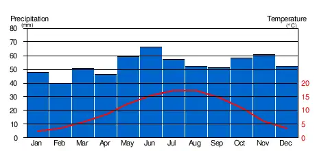 Climate in this area has mild differences between highs and lows, and there is adequate rainfall year round. The Köppen Climate Classification subtype for this climate is "Cfb" (Marine West Coast Climate/Oceanic climate).[9] However, the city is about 110 kilometres (68 mi) from the nearest coast.[note 1]