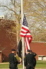 Members of the police academy would, Monday through Friday, conduct the flag raising and lowering ceremony on campus. The Flag Raising ceremony, which included both a United States National Flag and an MIA/POW Flag, was conducted before the beginning of classes. The Flag lowering ceremony would take place just before the conclusion of the business day of the college. This tradition began in 1988 when the police academy was moved to Camden County College. In September 2011 the Police Academy was moved to the Regional Emergency Training Center of Camden County College in Blackwood, New Jersey. With the move of the Police Academy to another CCC campus the raising and lowering ceremony, which included elaborate parade maneuvers by cadets and the singing of the United States National Anthem, was concluded in May 2011. The video below is the Flag Raising Ceremony at Camden County College by the Camden County Police Academy in April 2011.