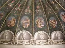 In 1524 an enclosure rule was forced on the convent, preventing male visitors, and for some two centuries the existence of the chamber's decoration remained unknown. In 1774 the painter and art historian Anton Raphael Mengs analyzed the work, which thenceforth became known as an important example of late Renaissance painting in Italy.[1] The iconography of the frescoes has been the subject of debate, and at present has not yet been conclusively explained.[2]