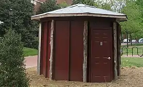 In his influential and meticulously annotated Latin edition of the works of Ibn al-Haytham and Witelo, Opticae thesauru (1572), German mathematician Friedrich Risner proposed a portable camera obscura drawing aid; a lightweight wooden hut with lenses in each of its four walls that would project images of the surroundings on a paper cube in the middle. The construction could be carried on two wooden poles.[51] A very similar setup was illustrated in 1645 in Athanasius Kircher's influential book Ars Magna Lucis Et Umbrae.[52]