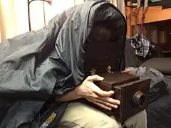 The box-type camera obscura often has an angled mirror projecting an upright image onto tracing paper placed on its glass top. Although the image is viewed from the back, it is reversed by the mirror.[9]