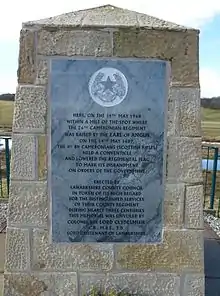 Face 5 of the British memorial on Spion Kop lists the names of the soldiers from the Cameronians who died at the Battle of Spion Kop during the Second Boer War.[36] The Cameronians War Memorial in Kelvingrove Park, Glasgow by Philip Lindsey Clark, unveiled on 9 August 1924, depicts men of the regiment manning a Lewis gun.[37] A monument commemorating both the founding of the regiment by the Earl of Angus in 1689 and its disbanding in 1968 can be found at Douglas, South Lanarkshire.[38] Also within the village is a statue of the Earl of Angus to commemorate the bicentenary of the raising of the regiment.[39]