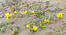 The beach suncup grows prostrate along the beach surface, forming mats more than 1 m across. It forms long stems growing from a central crown, lined with silvery grey-green leaves. The prostrate form and swinging stems allow the plant to survive well on the windy, shifting sands of the coast. The four-petalled flowers open in the morning (typical among suncups) and are bright yellow, fading to reddish.