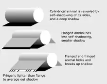 Some animals, such as the horned lizards of North America, have evolved elaborate measures to eliminate shadow. Their bodies are flattened, with the sides thinning to an edge; the animals habitually press their bodies to the ground; and their sides are fringed with white scales which effectively hide and disrupt any remaining areas of shadow there may be under the edge of the body.[59] The theory that the body shape of the horned lizards which live in open desert is adapted to minimise shadow is supported by the one species which lacks fringe scales, the roundtail horned lizard, which lives in rocky areas and resembles a rock. When this species is threatened, it makes itself look as much like a rock as possible by curving its back, emphasizing its three-dimensional shape.[59] Some species of butterflies, such as the speckled wood, Pararge aegeria, minimise their shadows when perched by closing the wings over their backs, aligning their bodies with the sun, and tilting to one side towards the sun, so that the shadow becomes a thin inconspicuous line rather than a broad patch.[60] Similarly, some ground-nesting birds, including the European nightjar, select a resting position facing the sun.[60] Eliminating shadow was identified as a principle of military camouflage during the Second World War.[61]
