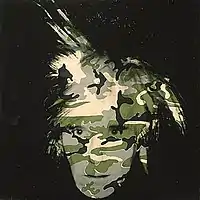 It uses a Polaroid photograph of him, with the material of acrylic polymer paint and silk screen printing[2] to produce a camouflage pattern over the face surrounded by black.
