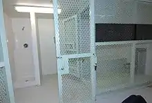 Camp Echo consists of separate one-story buildings, each a cell divided into two rooms by mesh grates. This division allows lawyers to consult with detainees in the area of their cells. Military officials also use the facilities to interrogate detainees, shackling them to the floor.[1] The eight feet by ten feet (2.4 m by 3 m) concrete buildings have narrow, slotted translucent plastic in the doors but no real windows; they are air-conditioned and heated. The cell side contains a toilet and a cot. The visitor side contains a table and chairs.[2]