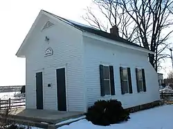 The building is rectangular with a wood frame and riverstone foundation. The frame is covered in 6-inch (150 mm) clapboard painted white. Sets of three four-over-four windows are on the north and south. The east side of the hall is the entrance and faces Town Hall Street just south of Illinois Route 64. The pair of doors each have four panels and sit under individual transoms. Originally, the building had a wood platform on this exposure, but this was replaced with concrete steps around 1940. The original chimney was altered to a two-flue chimney to allow for a heating system. Louver vents were also installed on the east and west around this time. The original roof had cedar shingles, but these were replaced with grey asphalt shingles.