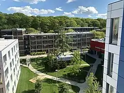 Stony Brook University is the largest residential public school in the state of New York, with nearly 10,000 students choosing to live on campus.[93] While the vast majority of housing is located on Stony Brook's West Campus, residential options are available at the East Campus and Stony Brook Southampton for undergraduate students, graduate students and their families. First-year students are divided into residential communitieses based on a system of "Undergraduate Colleges" that bring together students of similar interests.[94] In the 1960s, the Stony Brook University administration decided to name its dormitory buildings after the theme of "Great Deceased New Yorkers."[95]