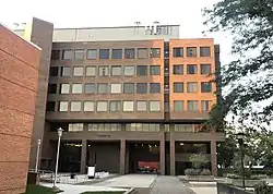 The Earth and Space Sciences Building is home to the Department of Geosciences. It opened in 1967 and was designed by the IBI Group – Gruzen Samton architectural firm. It has a concrete facade of the béton brut style, and the building has been described as brutalist and modernist.[47] The building was also the home of the Museum of Long Island Natural Sciences, which has hundreds of geological specimens, preserved Long Island sea and wildlife and Native American artifacts.[41] However, by 2017, the program was eliminated.[48] The building is four stories tall and contains a rooftop astronomy observatory.[47]