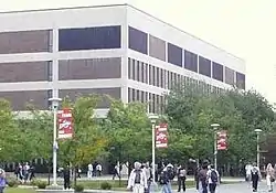 The Frank Melville Jr. Memorial Library is the main library at Stony Brook University's West Campus. It opened in 1963 and was soon expanded, more than quadrupling in size by 1971, when the building was dedicated to Frank Melville Jr., the father of Ward Melville.[8] It is located toward the eastern end of the Academic Mall and houses over two million volumes, ranging from government documents to music and film collections.[9] The building is six stories tall and the entire structure encompasses approximately 682,000 square feet of space. It is in use by over fifty different administrative and academic departments.[10] The Melville Library is also home to retail stores such as Shop Red West, a university bookstore, a Starbucks coffee shop, Amazon@Stony Brook (the first Amazon pickup location in the state of New York) and FedEx.