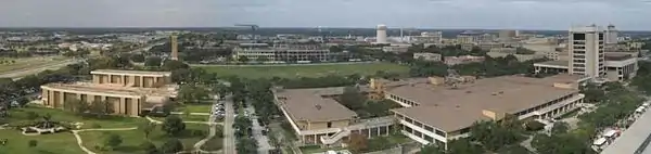 The campus is bisected by a set of railroad tracks primarily operated by Union Pacific Railroad.[2] The area east of the railroad tracks is known as "Main Campus"[3] and includes many of the academic buildings, the Memorial Student Center, Kyle Field, and the student dormitories. The portion of the campus west of the railroad tracks is known as "West Campus" and includes most of the other sports facilities, the business school, agricultural programs, the veterinary college, the George Bush Presidential Library and the medical school. The area of West Campus along Kimbrough Boulevard is known as "Research Park" and includes many research facilities.[4][5]