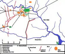The legionary fortress was larger than a standard castrum, and included a large annex on its north-east side.[5] It was protected by a large palisaded ditch and wall (Roman military Vallum and Fossa), along with new earthwork ditch and rampart defences, built to supplement the existing native defences.[3][30][31] One of these was around the Sheepen site, which became the main Roman port for the fortress and later for the town, with another military river port at Fingringhoe.[5] Archaeological excavations in 2008-2009 revealed that the Roman Sheepen site was more extensive than previously thought, and had a network of gravelled roads and timber-buildings, some of which contained timber-lined basements.[12] A wooden paddle for a coracle was found preserved at the site.[12] The fortress had two main metalled roads, a north–south via principalis and an east–west via praetoria, as well as a via sagularis around the inside of the defensive walls.[31] Along the roads leading out of the fortress settlements known as vici developed, home to native Britons who served the Roman garrison.[5] The interior of the fortress consisted of long barrack blocks able to hold groups of eighty soldiers, known as a Century, with a large room for a Centurian at one end of each block.[31] Larger buildings for military Tribunes have been excavated in the centre of the fort[31] The walls of the military buildings were built on mortared plinths called opus caementicium, with wooden and daub walls faced with keyed plaster.[31] Roman military equipment and weapons have been found from the fortress, including swords, armour and harness fittings.[3]