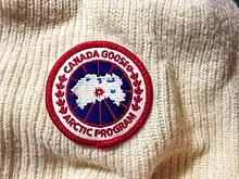The brand is best known for its distinctive red, white and blue circular logo, which is a "reverse image of the North Pole with the white representing the ocean while the islands are depicted by blue patches, encircled by lines of longitude and latitude to approximate the look and feel of a traditional Arctic Map. The outer ring of the logo contains "CANADA GOOSE" on the top and "ARCTIC PROGRAM" on the bottom, while each side has five maple leaves. The badge is usually placed on the upper arm of a coat or jacket. Canada Goose CEO Dani Reiss says “The badge makes people feel like they belong to a club” and describes Canada Goose as the “Swiss watch of apparel” and the “Land Rover of outerwear”.[28][36] A monochrome all-black variant of the logo is found on the brand's Black Label Collection, originally to cater to New Yorkers who find the standard logo too ubiquitous.[37][38] The logo is nearly identical in design to that of the United States Antarctic Program.
