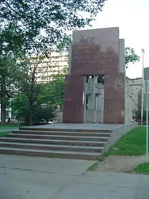 The Canadian Tribute to Human Rights, also known as the Human Rights Monument, is a monumental sculpture located at the corner of Lisgar and Elgin streets in Ottawa, Ontario, Canada. It was designed by Montreal artist and architect Melvin Charney and unveiled by Tenzin Gyatso, the fourteenth Dalai Lama, on September 30, 1990.[1]