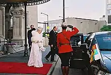 An official painted portrait of Queen Elizabeth II was created in 1976 and another by Scarborough, Ontario, artist Phil Richards was completed in 2012 mark the monarch's Diamond Jubilee.[19] The latter image depicts Elizabeth wearing her insignia as Sovereign of the Order of Canada and Order of Military Merit and standing in Rideau Hall beside a desk upon which is a copy of the Constitution Act, 1867 (granted Royal Assent by Queen Victoria and patriated by Queen Elizabeth), and a vase embossed with the Canadian Diamond Jubilee emblem; behind the Queen is the Canadian national flag and George Hayter's 1837 state portrait of Victoria.[20] The creation of this portrait is the subject of a National Film Board of Canada (NFB) documentary directed by Hubert Davis, which will be released in the fall of 2012 as part of the NFB's Queen's Diamond Jubilee Collector's Edition.[21][22] The painting was on 25 June installed in the ballroom at Rideau Hall.[23]