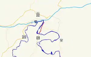 Wiley Ford is named for a shallow spot in the North Branch Potomac River just east of the present bridge over the river.[3] The first bridge at Wiley Ford was constructed around 1908; a replacement bridge was built in the late 1950s.[4][5] Traffic heading to Wiley Ford from downtown Cumberland travelled Virginia Avenue south from Oldtown Road, the old alignment of MD 51, then followed River Avenue southwest to its present intersection with Canal Parkway, then south across the river along Ford Avenue, which followed the same alignment as Canal Parkway today.[6] In addition to the route suffering from the standard problems of travelling through city streets, Virginia Avenue passed under the Baltimore and Ohio Railroad tracks via a low, narrow underpass that was vulnerable to flooding and, due to its location immediately south of Virginia Avenue's intersections with MD 51, was the frequent site of traffic jams. A problem at the underpass isolated South Cumberland south of the tracks from the rest of the city and required a lengthy detour through West Virginia. The same problems also hindered access to Greater Cumberland Regional Airport from the city.[7]