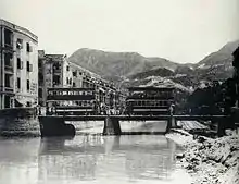 The original wooden bridge was replaced by an iron one that opened in March 1892.[1] During the reclamation from 1922 to 1929 that created modern Wan Chai (the Praya East Reclamation Scheme) a wider bridge (100 foot width) was built with a double line of tram tracks.[2]