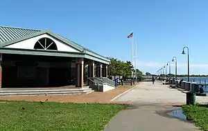 The 25-acre (10 ha) Golden City Amusement Park opened in May 1907 at what is now Seaview Avenue, near Canarsie Pier.[12]: 47 The owners hoped that the five-cent fare of the Canarsie Railroad would draw riders who would otherwise pay 10 cents to go to the Coney Island amusement area.[40] Golden City cost $1 million to build[41][42] and included a miniature railroad, a dance hall, a roller skating rink, and a roller coaster.[12]: 47 There was also a 300-foot-long (91 m) wooden shorefront promenade and a 2,500-seat theater with 7,000 electric lights.[41][42] The buildings were adorned with silver and gold.[42] Part of Golden City's appeal was that it was easily accessible from Manhattan via the elevated.[43][41] In August of that year, the Golden City Construction was leased to the Canarsie Amusement Company, who planned to make the park one of the world's largest.[44] In 1909, the park was severely damaged by a fire, which also destroyed two hotels.[45] The park was completely rebuilt for the next season.[12]: 48