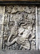 The walls of candi often displayed bas-reliefs, either serves as decorative elements as well as to convey religious symbolic meanings; through describing narrative bas-reliefs. The most exquisite of the temple bas-reliefs can be found in Borobudur and Prambanan temples. The first four terrace of Borobudur walls are showcases for bas-relief sculptures. These are exquisite, considered to be the most elegant and graceful in the ancient Buddhist world.[18] The Buddhist scriptures describes as bas-reliefs in Borobudur such as Karmavibhangga (the law of karma), Lalitavistara (the birth of Buddha), Jataka, Avadana and Gandavyuha. While in Prambanan the Hindu scriptures is describes in its bas-relief panels; the Ramayana and Bhagavata Purana (popularly known as Krishnayana).