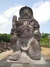 In East Javanese art and Balinese version however, the dvarapala usually depicted rather well-built and muscular, with a fine example taken from Adan-adan site near Kediri.[19] The exception is a gigantic dvarapala of Singhasari near Malang, East Java that measures 3.7 metres tall. The most notable dvarapala statues are those of candi Sewu, each pair guarding four cardinal points of the grand temple complex, making them a total eight large dvarapala statues in perfect condition. The dvarapalas of Sewu temple has become the prototype of Gupolo guardian in later Javanese art, copied as guardians in Javanese keratons of Yogyakarta and Surakarta. Another fine example is two pairs of dvarapala guarding the twin temples of Plaosan.