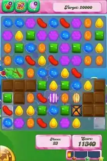 The game is split among many levels, which must be completed in sequence. Each level poses a different challenge to the user, such as achieving a minimum score in a fixed number of moves or clearing candies in a fixed number of moves to bring special ingredients to the bottom of the board. Boards have a number of different configurations and may include special spaces that have their own unique rules, such as spaces covered with jelly that must be cleared by making a match on that space.[4] If the player meets the level's goal, they will be given from one to three stars based on their score and can proceed onto the next level. Otherwise, they will lose one life and must try again. If the player runs out of lives, they have to wait for some period of real-world time while their lives regenerate before attempting the level again.[4] Completed levels can be replayed if desired.
