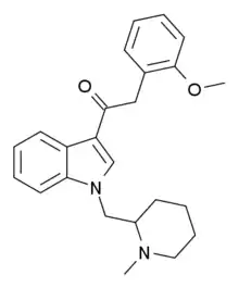 Cannabipiperidiethanone (CPE or 1-(N-methylpiperidin-2-ylmethyl)-3-(2-methoxyphenylacetyl)indole) is a synthetic cannabinoid that has been found as an ingredient of "herbal" synthetic cannabis blends sold in Japan, alongside JWH-122 and JWH-081. Its binding affinity was measured at the CB1 and CB2 receptors and it was found to have an IC50 of 591 nM at CB1 and 968 nM at CB2, making it 2.3 times and 9.4 times weaker than JWH-250 at these two targets respectively.[1]