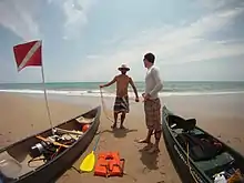 Getting into a kayak is the reverse of getting off. It is relatively easy to climb onto them from the side as the freeboard is low, but they are not very stable and are easy to capsize. The diver's weights are usually removed first and secured on the boat. Other loose equipment may be loaded at this stage. The scuba set is removed and clipped to a tether. Sufficient air to float the set must be in the buoyancy compensator. The fins are kept on the feet as they are used to boost the diver onto the kayak. Boarding is usually done by holding onto the kayak and using the fins to get roughly horizontal at right angles to the boat, then boosting over the kayak so that the hips are over the cockpit, face down, then rolling face up and sitting before swinging the legs onto the boat.[1]