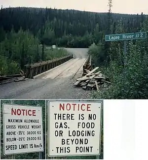 The Canol Road is not maintained in the Northwest Territories and all bridges are gone. The road remains passable for some distance past the border depending on the capabilities of the vehicle. Vehicles commonly drive as far as the airstrip and buildings located at Milepost 222.