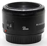 The EF 50mm lenses are a group of normal prime lenses made by Canon that share the same focal length. These lenses are based on the classic double-Gauss lens,[1] with the f/1.8 being a standard six-element double-Gauss with an air gap and powers between element 2 and 3[1] and its faster cousins adding additional elements.[2] The 50mm focal length, when used with a 35mm film or full-frame sensor, has been widely considered to match the perspective seen by the human eye.[3]