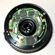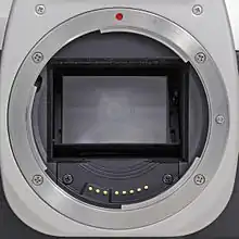 The EF lens mount is the standard lens mount on the Canon EOS family of SLR film and digital cameras. EF stands for "Electro-Focus": automatic focusing on EF lenses is handled by a dedicated electric motor built into the lens. Mechanically, it is a bayonet-style mount, and all communication between camera and lens takes place through electrical contacts; there are no mechanical levers or plungers. The mount was first introduced in 1987.