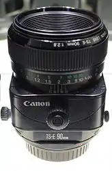 The Canon TS-E 90 mm f/2.8 is a tilt-shift, telephoto prime lens that provides the equivalent of the corresponding view camera front movements on Canon EOS camera bodies. Unlike most other EF-mount lenses, it does not provide autofocus.