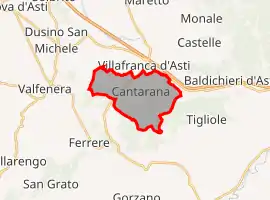 Cantarana is a comune (municipality) in the Province of Asti in the Italian region Piedmont, located about 30 kilometres (19 mi) southeast of Turin and about 13 kilometres (8 mi) west of Asti. As of 31 December 2004, it had a population of 863 and an area of 9.8 square kilometres (3.8 sq mi).[3]