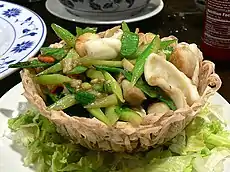 | Seafood with bird's nest | ![]() | 海鮮雀巢 | 海鮮雀巢 | hoi2 sin1 zoek3 caau4 | hǎixiān quècháo |