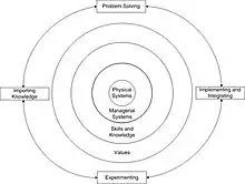 Around this complex of systems that realize a core capability Leonard situates a loop "Capability-Creating Activities" that comprise "Shared Problem Solving" and encompass Present and Future and Internal and External Perspectives (see Leonard, 1995, chapter 3). This capability development loop, is considered a system of organizational learning (knowledge-creating and knowledge-diffusing activities) and comprises the following activities: