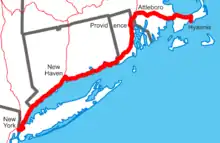Service beyond Harwich to Provincetown at the end of the Cape ended by the late 1930s. Regular service was suspended from 1941 to 1948, owing to World War II.[1] The New York, New Haven and Hartford Railroad ran combined through trains with the Pennsylvania Railroad from Washington to Hyannis until 1958. The Day Cape Codder and Neptune combined to provide service six days per week July–September, with the Day Cape Codder operating all days except Wednesday and Friday and the Neptune operating on Fridays only. The trains ran from New York to Hyannis, with a section splitting at Buzzards Bay, Massachusetts for Woods Hole, Massachusetts. Passengers coming from Boston connected in Providence, Rhode Island. The PRR and the NH offered a night train, The Night Cape Codder, from Washington and New York on Friday nights. The companies offered a return train from the Cape on Sunday nights. The companies' New York–Cape Cod service from 1958 to 1964 was summer only. The New Haven Railroad stopped serving Cape Cod altogether in 1964.[2]: 109–110 [3][4]