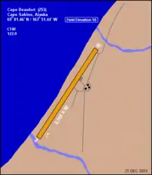 Cape Sabine Airport had one runway designated 2/20 with a 2,700 by 50 ft (823 x 15 m) gravel surface.[1]