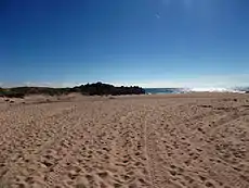 The cape has a small sheltered beach between its boulders known as Dois Cabos Beach, literally two headlands beach.