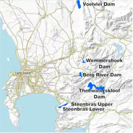 Periods of low winter rainfall in 2000–2001 and 2003–2004 resulted in water restrictions.[18][19] In 2003, the City entered into an agreement with the then Department of Water Affairs and Forestry for the construction of the Berg River Dam and Supplement Scheme and also commenced water demand management. In 2009, the storage capacity of the dams supplying Cape Town was increased by 17 percent from 768 to 898 million cubic metres when the Berg River Dam and Supplement scheme were completed.[20]