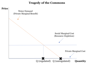 Surface water and rainfall exhibits properties of a common pool resource, which is subject to the tragedy of the commons. In the absence of regulation, self-interested individuals will make consumption decisions that deplete the commons, leading ecologist Garrett Hardin to declare that "freedom in a commons brings ruin to all".[86] This is particularly acute during a water crisis when total supply may fall short of even the socially optimal level of consumption. As such, the City attempted to regulate use of the commons through exhortations for responsible use, direct allotment and use of water tariffs (for consumers to internalize the social marginal cost of their decision making).