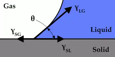where is the contact angle and the capital delta indicates the change from one configuration to another. To obtain this result, it's necessary to sum (distributed) forces at the contact line (where solid, gas, and liquid meet) in a direction tangent to the solid interface and perpendicular to the contact line: