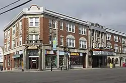 The Capitol Theater building is a large three-story brick and masonry structure at the northwest corner of Massachusetts Avenue and Lake Street in eastern Arlington. The building is stylistically diverse, featuring elements found in the Classical Revival, Baroque, and early Art Deco styles. The entrance to the theater is found on the long facade facing Massachusetts Avenue, flanked by several commercial storefronts.[2] There is a storefront with an angled entrance at the corner with Lake Street, and another on Lake Street that now provides access to part of the theater lobby.