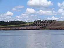 The Capivara Dam is an embankment dam on the Paranapanema River about 10 kilometres (6.2 mi) north of Porecatu, PR in Brazil. It is located along the border of the state of São Paulo to the north and the state of Paraná to the south. It was constructed between 1971 and 1978 for the primary purpose of hydroelectric power generation. The dam's first generator was commissioned in 1977. The dam can store up to 10,540,000,000 cubic metres (8,540,000 acre⋅ft) in its reservoir which also covers and area of 515 square kilometres (199 sq mi). It is operated by Duke Energy Generation Paranapanema International.[3]